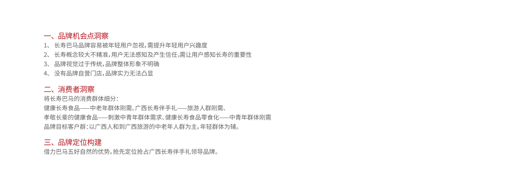 长寿巴马位于生态广西最知名的中国长寿之乡,拥有极好的生态环境。我们提炼出“五好食材”的超级文案,用五好食材作为长寿巴马的品牌定位。设置“关爱家人健康,远离工业食材”的痛点,让用户从此吃上五好食材。在产品矩阵构建时,设立甘甜巴马、仙境巴马、吉祥巴马、长寿巴马、童真巴马等系列产品,让长寿巴马的产品满足家庭消费各个群体需求和食用场景。