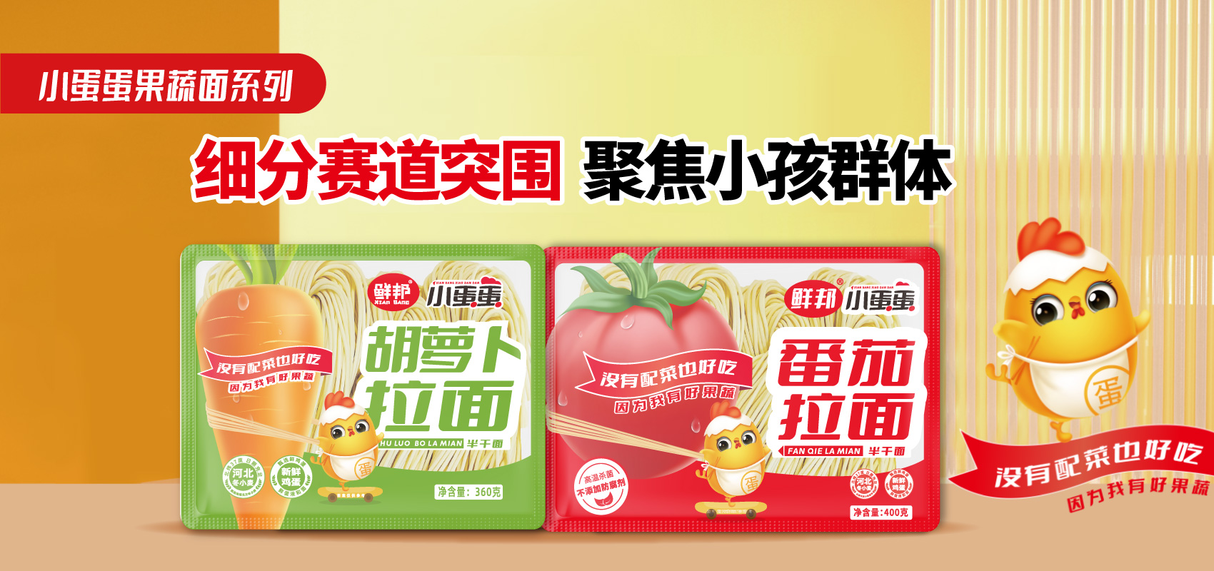 基于此我们聚聚焦加了鲜蛋液的鸡蛋面,创意性地提出“鲜邦小蛋蛋拉面”产品系列,并塑造“没有配菜也好吃,因为我有有好鸡蛋”的超级文案,精准聚焦消费者痛点,强化购买理由和购买决策。通过鲜邦小蛋蛋IP形象,